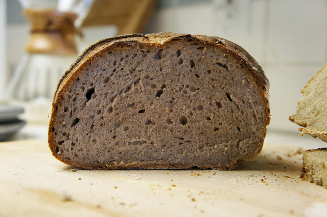 Using a sourdough culture given to me by a friend. Apparently it's from Germany. Think this is only my first or second sourdough loaf in the states, as I've had some trouble getting a starter going the few times I've tried. The numbering scheme is back. I'm guessing, but as long as it's roughly accurate that's okay.